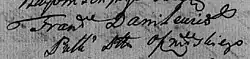 - Szymon Danilewicz (died after 1790) - heir of the Gudziana, Lewszany,[31] Piełaniszki estates, Trotsky Captain in 1774.[33] He was the son of Tadeusz, the captain of Trakai.[31] His spouse was Eugenia Randamańska.[33]