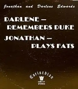 Darlene Remembers Duke, Jonathan Plays Fats is a 1982 album by Jo Stafford and Paul Weston in which they perform in character as Jonathan and Darlene Edwards. The duo present their own unique interpretation of the music of Duke Ellington and Fats Waller, with Stafford singing deliberately off-key, and Weston deliberately fumbling his way through piano arrangements. It was issued by Corinthian Records (COR-117). When it was released, Billboard said of it: "The sounds they achieve may well lead to another Grammy for the duo next year."[1][2] Stafford and Weston, in their Jonathan and Darlene Edwards personas, were interviewed by Los Angeles Magazine following the album's release.[3]