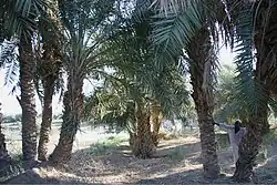 Date palm trees and Doum palms (Hyphaene thebaica) are perfectly adapted to the regional climate of Dar al-Manasir. They are drought resistant and can withstand the exceptionally hot dry and rainless summers and cold dry winters. The proximity of Ashu land to the river Nile makes the water table accessible to the deeply penetrating roots of fully grown palm trees throughout the year, making it the most valuable class of land.[4] Since dates constitute the most relevant cash crop in Dar al-Manasir their cultivation is not limited to Ashu land only, but expands along the irrigation channels of the Saqiah land. During recent years date trees even substitute seasonally irrigated crops such as wheat, beans and okra on the traditional Saqiah land.