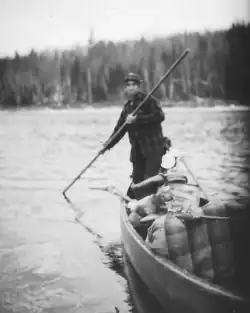 Dave was born 2 September 1902[3] at Ouellette Farm on the Saint John River. He was the eldest of six children of David Jackson and Elizabeth (Gardner) Jackson. The Jackson family owned a farm in Allagash, Maine. Dave's father farmed the land during the brief summers and assisted logging operations during the remainder of the year. Dave and his father freighted supplies up the Saint John River in pine pirogues from the Bangor and Aroostook Railroad at Saint Francis, Maine. Dave left school after the eighth grade to learn log driving before leaving home to work as a timber cruiser for International Paper Company.[4] He learned from the river drivers how to build a soft mattress of fir boughs to keep his bedding dry above the moist ground or snow.[5]