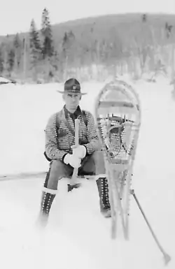 In 1929 Dave Jackson was employed as a Maine game warden assigned to live and work out of a small 255-square-foot (24-square-meter) cabin on Umsaskis Lake on the upper Allagash River.[3] The cabin was one-quarter mile (400 meters) from the unpaved Lacroix road from Lac-Frontière, Quebec and could be reached only on snowshoes for most of the winter.[6] His patrol area consisted of twenty townships with a combined population of about 3000 living mostly in 50 scattered logging camps. Patrols lasting up to ten-days were made on snowshoes through the winter months and by canoe or on foot during the summer.[7] The area had been logged in the early 19th century, and Édouard Lacroix began cutting second-growth hardwood and pulpwood in 1926.[8] Many of the men working in the logging camps were French Canadians unfamiliar with Maine laws, unable to read English, and accustomed to animal trapping and hunting for food.[9] Warden Jackson narrowly avoided being hanged by an illegal snare set for deer.[10] When he arrested poachers, they often had to snowshoe more than 60 miles (100 km) to court.[11]