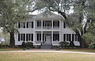 It was built about 1843, and is a two-story, frame vernacular Greek Revival style dwelling. It has weatherboard sheathing, a gable roof, and one-story, gabled-roofed ells at either side. The façade features a central, two-tiered portico with four pillars on each level. The house was built by Bertrand Davis, a locally known planter and militia officer.[2][3]