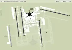 The airport is located on the border of Beijing and Langfang, Hebei. It has been nicknamed "the starfish".[6] It was completed on June 30, 2019, and began operations on September 26, 2019.[7][8][9][10] Beijing Daxing covers an expanse of 2,679 hectares (6,620 acres) and has four civilian runways and one military runway.[11]
