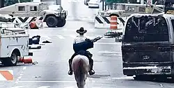 Shortly after the announcement, Sarah Wayne Callies was approached to play the role of Rick's wife Lori Grimes, the lead female.[15] Other actors garnering roles in the main cast include Steven Yeun, Chandler Riggs, and Jeffrey DeMunn.[13] "Days Gone Bye" featured guest appearances from actors and actresses such as Emma Bell (Amy), Andrea's younger sister.[16][17] Bell would later become part of the main cast as a recurring character.[18] Lennie James played Morgan Jones[19][20] and Jim Coleman guest performed Lam Kendal.[21] Linds Edwards played Leon Bassett, Rick's co-worker.[22][23] Keisha Tillis played Jenny Jones, Morgan's wife;[24] and Adrian Kali Turner played Duane Jones, Jenny's son.[25][26] Melissa Cowan played the bicycle girl walker;[27] Sam Witwer, who had collaborated with Darabont in The Mist (2007), appeared as a dying soldier;[28] Addy Miller played the teddy bear girl walker;[29] and Joe Giles played an Atlanta walker who followed Rick.[30] Frances Cobb played a camp survivor.[31] Blade is the horse ridden by Andrew Lincoln.[32][33]