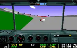 In the PC version, gameplay consisted of setting up the car, qualifying, and then the actual race event. If the player finished in a high enough position, they would progress to the next circuit. Damage was calculated not by realistic damage displayed on the car but a "cracked dashboard" bar indicator, with cracks appearing along the dashboard when the player hits something (the same as that used in the 1989 release Stunt Car Racer).