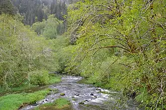 Upstream of Deadwood, the creek passes under Deadwood Creek Bridge, a covered bridge carrying Deadwood Loop Road.[5] The bridge was added to the National Register of Historic Places in 1979.[6]
