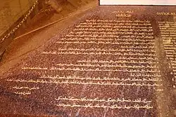 On 18 December 2006, the president of Azerbaijan Ilham Aliyev signed Order No. 1838 on the creation of the Museum of Independence and the establishment of the Monument of Independence in Baku. The opening of the monument took place on 25 May 2007, on Istiglaliyyat Street. Ilham Aliyev attended the opening ceremony.[45] Carved from granite and white marble, the monument is engraved with the text of the Declaration of Independence in both the old Arabic and modern Latin scripts.[46]