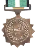 The medal consists of two synonymous surfaces of copper coated with oxidised silver: the lower surface consists of fourteen in a circle of 50 millimetres in diameter bearing on the back the phrase 'Victory 1971' in the middle of a circle of 32 millimetres in diameter and on both sides of it are olive branches. The upper surface is a circle with a diameter of 32 millimetres, on which is the picture of the President, Commander Jaafar Muhammad Nimeiri, receiving the torch of victory from the masses of the people on Victory Day. The decoration hangs from a ribbon of shiny silk, 32 millimetres wide. It consists of two black lines on both sides of the ribbon, each 3 millimetres wide. Each line is directly followed by a green line of the same colour as the flag of Sudan. Its width is 10 cm. In the middle is a white line whose width is 6 millimetres.[5] |