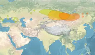 ![]() ![]() [-1000] General location of the Deer stones, and contemporary Asian polities c. 1000 BCE. : Type I, : Type II, : Type III, and scattered individual finds. The three types can be found together in the area of western Mongolia.[1] | |