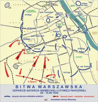 The Defense of Ochota and Wola[1] refers to military actions undertaken by the Polish Army on 8–9 September 1939 during the September campaign, in the districts of Ochota and Wola in Warsaw. The result was the repulsion of the German assault by the 4th Panzer Division and thus the thwarting of the German plan for a rapid capture of the Polish capital.