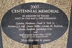 A memorial stands along a walking and bike path on Sooner Road and is dedicated to the seven people who lost their lives during the May 3 tornado.[36] United States Air Force Staff Sergeant James Day was killed in an ATV accident on May 8, 1999, while he was patrolling an area of Tinker AFB, Oklahoma, which had been damaged in the tornado. He is also listed on the memorial.[37]