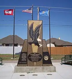 The war memorial located opposite the Del City Community Center has several monuments dedicated to those who were killed in combat who were either born or lived in Del City. The memorial is dedicated to twenty one servicemen killed while serving in various branches of the U.S. Military during World War II, the Vietnam War and the Iraq War. Dedicated in November 2010, the memorials include an armored personnel carrier and a Fallen Soldier Battle Cross being watched over by two crouched U.S. servicemen. The memorial also has a time capsule.[11]