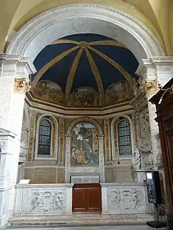 La Malfa claims that the grotesques on the pilasters were clearly inspired by those painted in the Domus Aurea (the so-called Room of Achilles on Skyros) and the wall decoration was executed no later than 1479, that is before the building of the tomb of Cristoforo Della Rovere.[5] In this case they could be among the earliest of their kind in Rome.