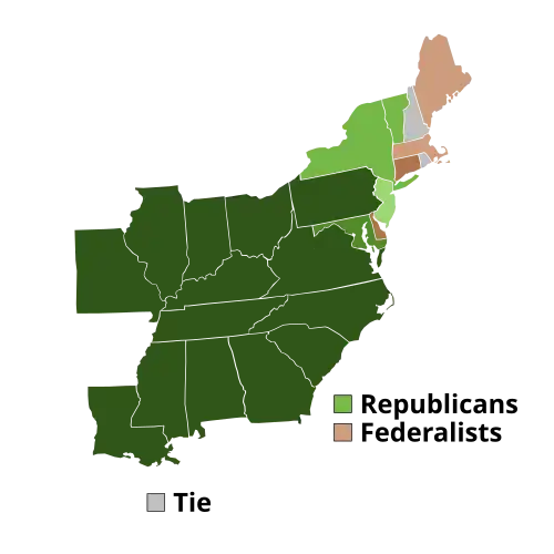 Madison and Jefferson formed the Democratic-Republican Party from a combination of former Anti-Federalists and supporters of the Constitution who were dissatisfied with the Washington administration's policies.[144] Nationwide, Democratic-Republicans were strongest in the South, and many of party's leaders were wealthy Southern slaveowners. The Democratic-Republicans also attracted middle class Northerners, such as artisans, farmers, and lower-level merchants, who were eager to challenge the power of the local elite.[145] Every state had a distinct political geography that shaped party membership; in Pennsylvania, the Republicans were weakest around Philadelphia and strongest in Scots-Irish settlements in the west.[146] The Federalists had broad support in New England, but in other places they relied on wealthy merchants and landowners.[147] After 1800, the Federalists collapsed in the South and West, though the party remained competitive in New England and in some Mid-Atlantic states.[148]