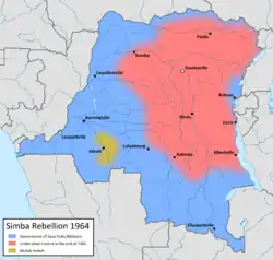 Rwandan exiles continued to play an important role for the Simba forces due to the gradual end of other foreign support.[41] The "Rwanadese Popular Movement" and the "Rwanda Youth National Union" led by Jean Kayitare, son of Rwandan exile leader François Rukeba, each mobilized a battalion to assist the beleaguered Simbas. One Rwandan exile later explained that their continued support for the Simba rebels was mostly motivated by the fact that they were being expelled from other countries such as Burundi, making this "the only choice we had". Despite this, their working relationship with the Congolese insurgents became more strained.[39] The Simba rebels also alienated the Banyamulenge who lived in South Kivu during this time, as the retreating insurgents killed the Banyamulenge's cows for food. Even though they were related to ethnic Rwandans, the Banyamulenge had previously tried to remain neutral and now opted to side with the Congolese government. They organized militias and began to hunt for the rebels.[42]