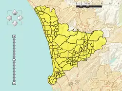 The county's largest continuous high-income urban area has the appearance of a triangle constructed from a first point on the northern edge of Carlsbad, a second point northeast of Poway and a third point on the southern edge of La Jolla in San Diego. The region is pictured to the right. It contains all or most of the cities of Carlsbad, Encinitas, Solana Beach, Del Mar, and Poway in addition to a substantial portion of northern San Diego.[1]