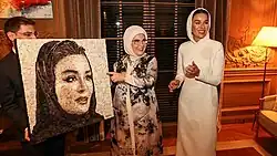 Emine Erdoğan presenting a painting by artist Deniz Sağdıç to Sheikha Moza