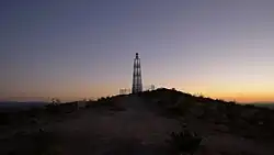 Sometime after 2010, Hawkins had previously built a lighthouse nearby in the Lucerne Valley area of the Mojave Desert but it was subsequently destroyed and dismantled by vandals and scavengers.[3] In 2014, Hawkins presented an exhibition title "Desert Lighthouse Ultimatum" at the University of California, Riverside's Culver Center for the Arts Museum.[4] The theme of his exhibition was the return of his effort to establish a permanent lighthouse in the Mojave Desert.[5] Three years later on July 1, 2017 the Desert Lighthouse was unveiled to the public during an evening "Launch Event".[2]