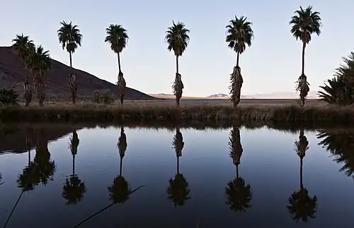 Utilizing pioneer desert species like the Acamptopappus shockleyi or Lepidium fremontii which are native to the Mojave Desert,[12] and halophytes such as Salicornia contribute positively to desert greening efforts. Planting of trees which store water, inhibit soil erosion through wind, raise water from underlying aquifers, reduce evaporation after a rain, attract animals (and thereby fertility through feces), and they can cause more rain to fall (by temperature reduction and other effects), if the planted area is large enough.[13] Another method of introducing or re-introducing vegetation to deserts is through seeding which involves the scattering of seeds either manually or aerially depending upon the size of the region undergoing vegetation efforts. Using seeding as a desert greening technique on a large scale requires a longer time for the ecosystem to recover and for the vegetation to establish itself as was seen in the Mu Us Desert.[14] Additionally, there are potential downsides due to the environmental vulnerability and predation by desert animals putting the success of this technique at risk.[15]