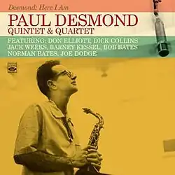 Desmond: Here I AM is a jazz compilation album issued by the Fresh Sound label in 2015.[1] It contains the first two record releases of alto saxophonist Paul Desmond as a leader: Paul Desmond Quintet with The Bill Bates Singers, a 10-inch vinyl record from 1954,[2] and Paul Desmond Quartet Featuring Don Elliott, a 12-inch from 1956,[2] both originally released on the label Fantasy Records.[3]