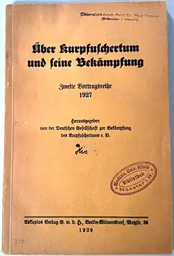 Since 1899, there was a Quackery Commission in the umbrella organisation of physicians' associations, the Ärztlicher Vereinsbund.[3] This led Carl Alexander to found the DGBK in 1903.[4] After the first annual general assembly of 14 January 1904, the DGBK started providing information and cooperated on legislative measures, to which end several commissions were formed.[3] With pamphlets and lectures, lay people as well as professionals were educated.[3] There was lobbying against naturopathy, antivaxxers and also doctors who practised homeopathy. The association primarily sought to warn the public against unskilled lay healers. In 1911, the DGBK participated with the DGBG in the International Hygiene Exhibition of Karl August Lingner, the founder of Odol (a mouthwash brand), in Dresden, to which other organisations were demonstratively not invited.[5] In response, in the summer of 1911 a counter-event was held entitled "Congress of Naturopathy and People's Welfare".[6] The association managed to combine left and conservative forces alike[4] and organise travelling exhibitions.[7] In 1927, 53,000 paying visitors came to an exhibition in Ludwigshafen.[8]