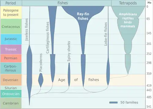 Sea levels in the Devonian were generally high. Marine faunas continued to be dominated by conodonts,[37] bryozoans,[38] diverse and abundant brachiopods,[39] the enigmatic hederellids,[40] microconchids,[38] and corals.[41][42] Lily-like crinoids (animals, their resemblance to flowers notwithstanding) were abundant, and trilobites were still fairly common. Bivalves became commonplace in deep water and outer shelf environments.[43] The first ammonites also appeared during or slightly before the early Devonian Period around 400 Ma.[44] Bactritoids make their first appearance in the Early Devonian as well; their radiation, along with that of ammonoids, has been attributed by some authors to increased environmental stress resulting from decreasing oxygen levels in the deeper parts of the water column.[45] Among vertebrates, jawless armored fish (ostracoderms) declined in diversity, while the jawed fish (gnathostomes) simultaneously increased in both the sea and fresh water. Armored placoderms were numerous during the early ages of the Devonian Period and became extinct in the Late Devonian, perhaps because of competition for food against the other fish species. Early cartilaginous (Chondrichthyes) and bony fishes (Osteichthyes) also become diverse and played a large role within the Devonian seas. The first abundant genus of cartilaginous fish, Cladoselache, appeared in the oceans during the Devonian Period. The great diversity of fish around at the time has led to the Devonian being given the name "The Age of Fishes" in popular culture.[46]