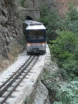The Diakopto–Kalavryta railway (Greek: Οδοντωτός σιδηρόδρομος Διακοπτού - Καλαβρύτων, romanized: Odontotós sidiródromos Diakoptoú - Kalavrýton) is a historic 750 mm (2 ft 5+1⁄2-in) gauge rack railway in Greece. Located on the northern Peloponnese, it runs 22 kilometres (14 mi) from Diakopto through the Vouraikos Gorge and the old Mega Spilaion Monastery and up to Kalavryta, stopping en route at Zachlorou. Today, the stations infrastructure and rolling stock are owned and maintained by the GAIAOSE and the line infrastructure Hellenic Railways Organisation (OSE) and passenger trains are operated by Hellenic Train.[3] At the Diakopto terminus, the line connects with the new standard-gauge Athens Airport–Patras railway where the new main line tunnels under the station yard. It now takes 2 hours 10 minutes to reach Athens.