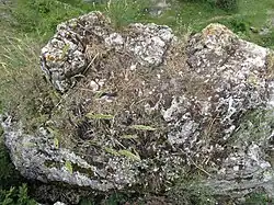 Discreet habitat preferences may coincidentally spare many owls, as owls from the genera Strix, Glaucidium, Aegolius and the 320 g (11 oz) northern hawk-owl (Surnia ulula) tend to restrict both nesting and their hunting forays to more enclosed areas of woodland than habitats inhabited by the eagle-owls.[128][148] Meanwhile, Asio, Otus, Athene and barn owls owls tend to hunt in more open habitats than the edges favored by eagle-owls.[2] However, habitat preferences are never enough to spare any of these genera from predation by the great eagle-owl. In the Italian Alps, despite differing habitat preferences and partially overlapping prey, several tawny owls were killed by eagle-owls.[149] Woodland nesting owl species tend to nest in tree hollows, many of which are too small for an eagle-owl to access, so are somewhat less likely to be picked off at their nests. Open-country owls that tend to nest in open-access nesting sites like short-eared owls and little owls may be somewhat more vulnerable at the nest. The great numbers of long-eared owls taken, since it often nest in dense, protective thickets, are probably adult or immature owls attempting to hunt. In Europe, Eurasian eagle-owls are generally the only owls to regularly nest in rocky habitats. This is not the case in arid desert-like regions, where limited nesting options frequently force diverse owls to use rocky areas as nesting sites.[3][128] However, the cliffs and other rocky areas preferred by Eurasian eagle-owls are also utilized by several species of diurnal raptor in Eurasia. In Spain, golden eagles, Bonelli's eagles and peregrine falcons (Falco peregrinus) most often nest on cliffs. Large scavenging birds such as cinereous vultures (Aegypius monachus), bearded vultures (Gypaetus barbatus), Eurasian griffons (Gyps fulvus), Egyptian vulture (Neophron percnopterus) and common ravens also often nests on the same Iberian cliffs. While the two eagles nested at great distances from one another (they are known to be territorial towards each other), the eagle-owl nesting within 2 to 3 km (1.2 to 1.9 mi) of the other species. In these cliff nests, the only considerable predatory interaction was the eagle-owls appearing to predate the peregrine falcons.[150] In the Tibetan Plateau, upland buzzards (Buteo hemilasius) also seem to favor similar habitats and both the eagle-owl and buzzard take similar prey there.[50] In general, the eagle-owl can nest closer to diurnal raptors because, as a nocturnal animal, it will not actively compete for territories as it would with other members of its species.[2]