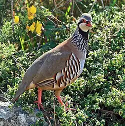 In generally warmer areas of the Eurasian continent, the diverse pheasant family replaces the grouse as the significant group of birds in the golden eagle's diet. Across the range, pheasants make up 5.7% of the diet of this species. Unlike grouse, pheasants are not known to comprise more than half of the nest remains in any study, but they can be important nonetheless. This is especially true in Spain, where most studies show that the pheasants at 22.8-28.7% of the diet, mainly the red-legged partridge (Alectoris rufa), are the second most prominent prey species after the European rabbit, with the red-legged partridge and the rabbit collectively making up to more than 90% of the prey remains in several nests there.[46][47] The red-legged species, along with the rock partridge (Alectoris graeca) and grey partridge (Perdix perdix), are the leading prey group in the French Pyrenees at 15.8% of a sampling of 114 from 10 nests.[33] In Hungary, the common pheasant (Phasianus colchicus) appears to be the favored prey species, making up 26.6% of the prey of a sampling of 49 from 4 nests there.[59] In Japan, the copper pheasant (Syrmaticus soemmerringii) is the second most common single prey species, making up 17.8% of the remains (sample size of 967 from 5 nests).[54] In the Caspian Sea area of Kazakhstan, the most common bird species (and third most common overall prey species) is the chukar (Alectoris chukar), representing 19.5% of a sampling of 468 from 36 nests.[67] Chukar and Caspian snowcock (Tetraogallus caspius) are reportedly the primary avian prey species in Armenia.[53] In the Himalayan region, two very large pheasants, the Himalayan monal (Lophophorus impejanus) and the Himalayan snowcock (Tetraogallus himalayensis), are reportedly among the most significant prey for eagles.[80] Moorland francolin (Scleroptila psilolaemus) were reportedly the most common bird prey species in Ethiopia's Bale Mountains, comprising 10% among a sample size of 49 at 4 nests.[57] North America has fewer native pheasants species but introduced species such as grey partridge, ring-necked pheasant and, especially, chukar are readily hunted (native quail seem to be largely or entirely ignored as prey by golden eagle, perhaps because of their small size or dense thicket-dwelling habits).[38][44][81][82] The chukar is the most significant bird species in the diet in Nevada (at 5.4%) and the second most significant bird species in Washington state (at 11.8%).[39][44][45] One native North American "pheasant" known to be occasionally hunted is the wild turkey (Meleagris gallopavo), the largest species of galliform. The golden eagle is the only major avian predator of adult turkeys. The hunting techniques used on pheasants are probably similar to those used for grouse. Pheasants hunted by golden eagles are also similar in size in grouse. Alectoris sp. weigh around 500 g (1.1 lb) and medium-sized species weighing around 1 kg (2.2 lb). Snowcock will often weigh 2.5 to 3 kg (5.5 to 6.6 lb), whereas the female and male adult turkey weigh around 4 kg (8.8 lb) and 8 kg (18 lb), respectively.[78] On a wildlife monitoring camera in Tennessee, a golden eagle was filmed assaulting an adult turkey, appearing to use a "contour flight with short glide attack" but the quarry in this case appears to successfully avoid the strikes by running and then ultimately flying away.[83] Breeding pairs of eagles have been known to hunt turkeys cooperatively.[84]