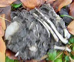 Upon capture, small prey like shrews and rodents are often swallowed whole, while others may be torn into pieces. Often prey is dismembered in order to more easily ingest it whole, i.e. decapitating mice, removing the legs from frogs while birds like sparrows are also regularly decapitated (with the head often eaten separately) and nearly all avian prey is plucked before being consumed.[7][28][29][30] One tawny owl was observed to eat a squirrel by leaving the head intact and peeling the skin back from the neck, apparently leaving bones in place while consuming the flesh.[31] Indigestible items, including fur, feathers, bones (which sometimes visibly protrude out of the peller), sometimes intestines and invertebrate carapaces, are regurgitated in large pellets, that can be anywhere in typical size from 20.3 to 67 mm (0.80 to 2.64 in) long with a diameter of 17 to 30 mm (0.67 to 1.18 in). The pellets are typically grey coloured and are found in groups under trees used for roosting or nesting. At least some tawny owl pellets can measure up to 84 mm (3.3 in) long and can include large objects such as an intact 10 cm (3.9 in) bill of a snipe.[7][1][29][32] Undigested material coughed up often reveals different prey than pellets.[7] Estimated daily food requirements for a tawny owl is 73.5 g (2.59 oz), which is proportionately lower (at about 14% of their own body mass) than the estimates for other medium-sized owls in Europe (at 23–26% of their own body mass), therefore tawny owls can appear to live off of relatively little food quite efficiently.[33]