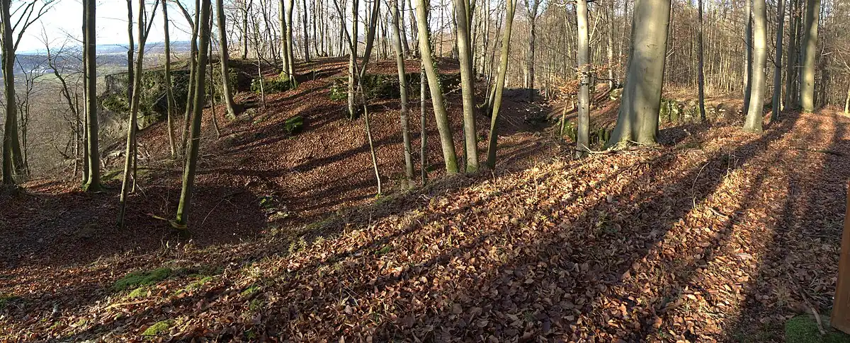 The now levelled castle once stood on the edge of the plateau where it drops vertically into the valley of the Trubach. A small rocky spur, which projects south from the rock face, was divided by a semi-circular moat. This striking ditch, which may have been formed as the result of a rockslide, was further extended during the construction of the castle. Today it has a width of 12 to 14 metres and still has a depth of about five metres. At the ends of the moat, which run up to the rockface of the plateau, there are almost no signs of any rubble heaps, an indication of the natural formation of the ditch. At the northern end of the ditch the plateau descends a little, so that the floor of the ditch and the terrain in front of it were at the same level. Here a wall was built to hinder an enemy wanting to enter the moat. A 17-metre-long section of this rampart still remains, running along the outer edge of the moat before turning inwards to form a barrier at the side. The rampart here is still about 0.5 metres high and three metres wide.