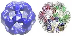 The dodecahedral catalytic core structure made up of 60 dihydrolipoyl transacetylase subunits from Geobacillus stearothermophilus: 3D electron microscopy map (left) and X-ray diffraction structure (right).[7]