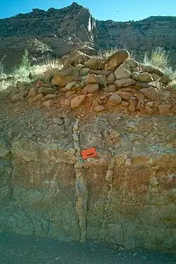 A magmatic dike is a sheet of igneous rock that cuts across older rock beds. It is formed when magma fills a fracture in the older beds and then cools and solidifies.[2][3][4] The dike rock is usually more resistant to weathering than the surrounding rock, so that erosion exposes the dike as a natural wall or ridge.[3] It is from these natural walls that dikes get their name.[5]