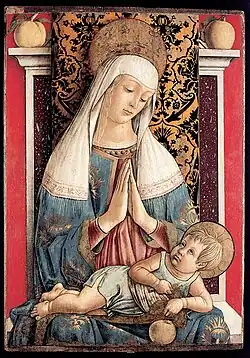 - Room 1 contains mostly paintings from the Venetian painter Carlo Crivelli, who was active in the region of Ascoli from 1468, and his most important student, Pietro Alamanno. Among the works by Crivelli is the Madonna of Poggio Bretta made between 1470 and 1472, and by Alamanno is the tavola cuspidata of 1485, brought here from Cerreto di Venarotta. Also found here is an interesting antependium textured with silk and gold thread from the end of the 15th century which comes from the cathedral of Ascol.