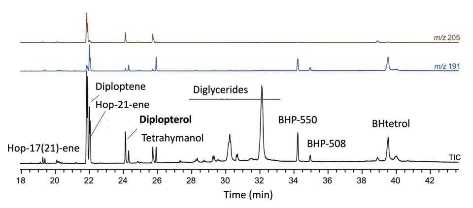 - ^ a b c Sessions, Alex L.; Zhang, Lichun; Welander, Paula V.; Doughty, David; Summons, Roger E.; Newman, Dianne K. (2013). "Identification and quantification of polyfunctionalized hopanoids by high temperature gas chromatography–mass spectrometry". Organic Geochemistry. 56: 120–130. Bibcode:2013OrGeo..56..120S. doi:10.1016/j.orggeochem.2012.12.009. PMC 3780965. PMID 24496464.