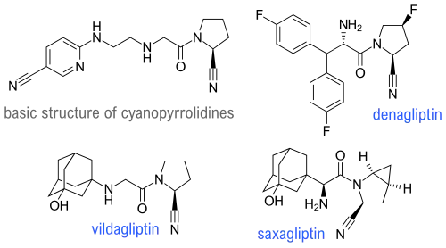 Substrate-like inhibitors (Figure 4) are more common than the non-substrate-likes. They bind either covalently or non-covalently and have a basic structure where the P1-substituent occupies the S1-pocket and the P2-substituent occupies the S2-pocket. Usually they contain a proline mimetic that occupies the S1-pocket. Large substituents on the 2-cyanopyrrolidine ring are normally not tolerated since the S1-pocket is quite small.[12] Since DPP-4 is identical with the T-cell activation marker CD26 and DPP-4 inhibitors are known to inhibit T-cell proliferation, these compounds were initially thought to be potential immunomodulators. When the function against type 2 diabetes was discovered, the cyanopyrrolidines became a highly popular research material. A little later vildagliptin and saxagliptin, which are the most developed cyanopyrrolidine DPP-4 inhibitors to date, were discovered.[6]