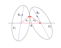 - unit vector joining the centers of the two ellipses.