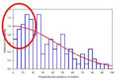 In summary, modeling how detectability drops off with increasing distance from the transect allows estimating how many objects there are in total in the area of interest, based on the number that were actually observed.[2]