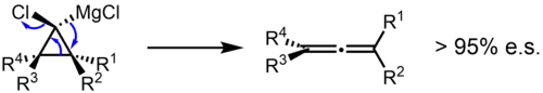 In a study in which an enantioenriched substituted cyclopropyl Grignard reagent was prepared, the reaction was shown to give the allene with very high levels of enantiospecificity, suggesting a concerted mechanism.[4] Similarly, in a computational study of the bromolithiocyclopropane, a concerted mechanism was found to be favored. A discrete cyclopropylidene carbene was found to be unlikely, although early ejection of LiBr (roughly simultaneous to C–C bond scission and before formation of the orthogonal pi bonds of the allene) was suggested.[5]