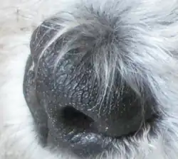The wet nose, or rhinarium, is essential for determining the direction of the air current containing the smell. Cold receptors in the skin are sensitive to the cooling of the skin by evaporation of the moisture by air currents.[6]
