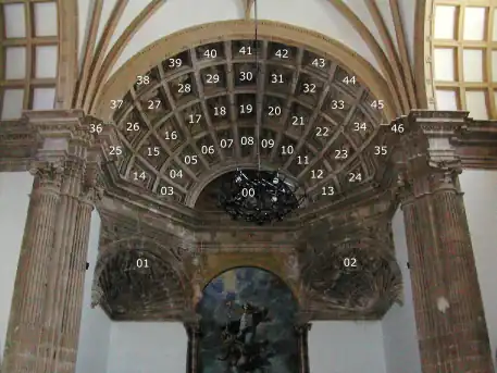 In the corners of the ceiling of the main chapel are two squinches with shell alcoves, in which the arms of the priory's patrons Rodrigo Messía and Mayor de Fonseca are depicted again, flanked by angels. Above them are two pairs of virtues: Strength and Justice over the shield of Messía, and Faith and Charity over that of Fonseca. Covering the eastern end of the chancel is a quarter-spherical vault in which an extensive iconographic scheme is represented in individual coffers, including virgin saints, martyrs of antiquity, prophets and other characters from the Old Testament, the Fathers of the Latin Church and the saints of the Order.[5] Presiding over the altar is a beautiful fresco of Saint Dominic, the order's founder, and above it the arms of the Dominican Order flanked by two greyhounds carrying torches in their jaws, the emblems of Saint Dominic.