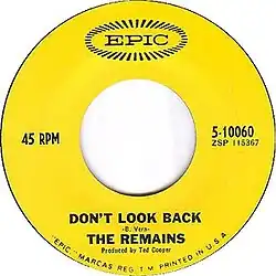 "Don't Look Back" was the Remains' last single on Epic Records. The song was composed by Billy Vera,[4] who composed and recorded "Storybook Children" for Atlantic Records. "Don't Look Back" was released as Epic 10060 in 1966. Its B-side was "Me Right Now", composed by Barry Tashian, the Remains' leader.
