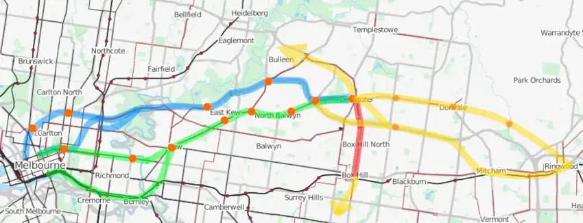 • Orbital Network: “South to Box Hill” - a connection from Box Hill railway station; now proposed as part of a future northern section of the Suburban Rail Loop