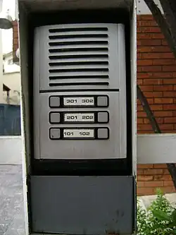 The simplest version is an intercom that establishes a communication between an entryway at street level and a resident inside the house. A loudspeaker installed at the street level entrance allows a building resident to speak to their visitor. In buildings where there are more than one door phone plate located outside of a building's entrance, each door phone has a certain number of buttons depending on the number of units in each building.