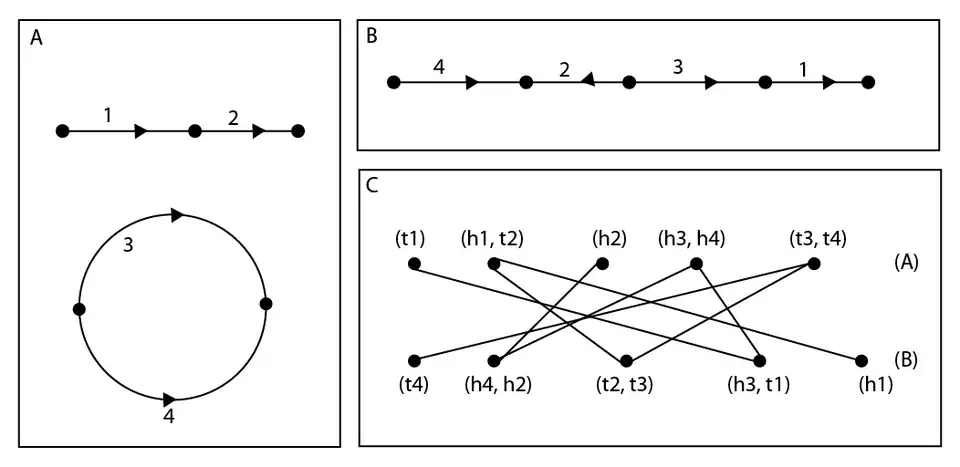 A genome is described as a directed, edge labeled graph with each vertex having degree 1 or 2. Edges are labeled as synteny blocks, vertices of degree 1 represent telomeres, and vertices of degree 2 representing adjacencies between blocks. This requires that the genome consist of cycles and paths. Each component is called a chromosome. The beginning of each edge is called the tail, the end of each edge is called the head; together heads and tails are known as extremities. Vertices are described by their roles as heads and tails of blocks, for instance, in the figure, the adjacency which forms the head of marker 1 and the tail of marker 2 is labelled (h1, t2), the telomere formed by the head of 2 is (h2). A double cut and join (DCJ) operation consists of one of the following four transformations: