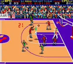 While the Arcade Version has time based play, the NES version allows you to play the full game regardless of score. Quarters can be played with 5, 10, 20, or 30 minute lengths. Single Player games can be played against three CPU skill levels, and a Versus Mode is also available for two players to play against each other. Players can choose from one of four teams: Boston, Chicago, Los Angeles and New York. There is no difference in skill level or abilities between the teams. In 1P Mode, the CPU Team will always be Boston, but in versus mode, the only rule is that both players can't be the same team. Since there is no NBA license, no team names or player names are used, but the teams wear the same color of their NBA counterparts, and the teams had similar names: L.A. Breakers, Boston Frogs, Chicago Ox, and New York Eagles.