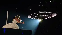 Starting from the May 2024 shows in Paris, Swift included "Down Bad" in the set list of the Eras Tour.[5] She performed the song while sitting on a rotating metal block that moved around the stage[6] as an image of an UFO appeared above her.[7][8]
