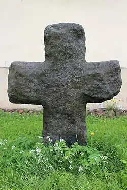 - Church of St. Lawrence – Gothic Revival, a deanery sanctuary. It houses an 1804 painting of The Martyrdom of St. Lawrence by Karl Sigismund and St. Lawrence's relics installed in 1999. Outside, a likely late-medieval granite stone cross,[23] often misidentified as a conciliation cross, though no evidence supports this. The assumption that all old monolithic stone crosses are penitential lacks substantiation,[24] as their origins could vary.[25][26] This hypothesis has become popular but is often presented without noting its speculative nature.[27]