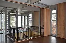 This forms a "base" on which the main level appears to float. The main level is covered with redwood heartwood siding, installed vertically and stained to mimic weathered driftwood. There are large sections of glass windows and doors. The windows and doors have thin metal sashes and wood casings. A tall trim board separates the lower level from the main level between the brick walls and wood siding. The roof appears like a flat plane. The roof is supported by wood rafters spaced 10 feet (3.0 m) on center. The rafters continue through the tops of the walls and support wide overhanging eaves. The owners used the roof as a rooftop deck for viewing the lake.[2]