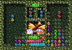 Dr. Robotnik's Mean Bean Machine is based on Puyo Puyo, a Japanese falling-block puzzle game. In the story, players must rescue Beanville from Dr. Robotnik and his army of Badniks. In Scenario Mode, the player plays against 13 increasingly challenging computer opponents. In the multiplayer 1P vs 2P Mode, two players battle against each other, and in Exercise Mode, players can simply practice.[7][6] The Game Gear and Master System versions feature an additional mode, Puzzle Mode, in which players must attempt to clear predetermined sets of beans. On each player's grid, groups of beans fall from the top of the screen and can be moved and rotated until they reach the bottom. When four beans of the same colour are matched together, they disappear from the grid, causing any beans above to drop.[8][9][10] These beans can trigger other matches, resulting in chain combos.[10] By performing chain combos, players can send grey "refugee beans" to hinder their opponent. These beans cannot be matched normally and can only be removed by completing a match adjacent to them.[11] A player loses when beans spill over the top of the board, leaving them unable to add more beans into the grid.[12]
